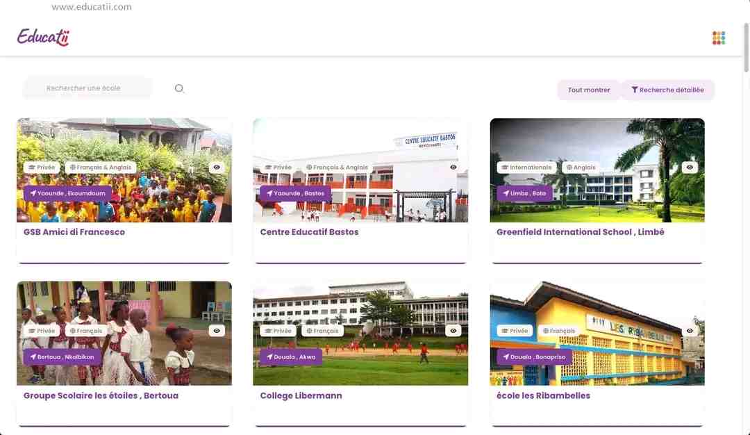 La seconde phase du projet Educatii est à présent en usage . Elle consiste à un portail de toutes les écoles du Cameroun possédant un site web . Les parents peuvent